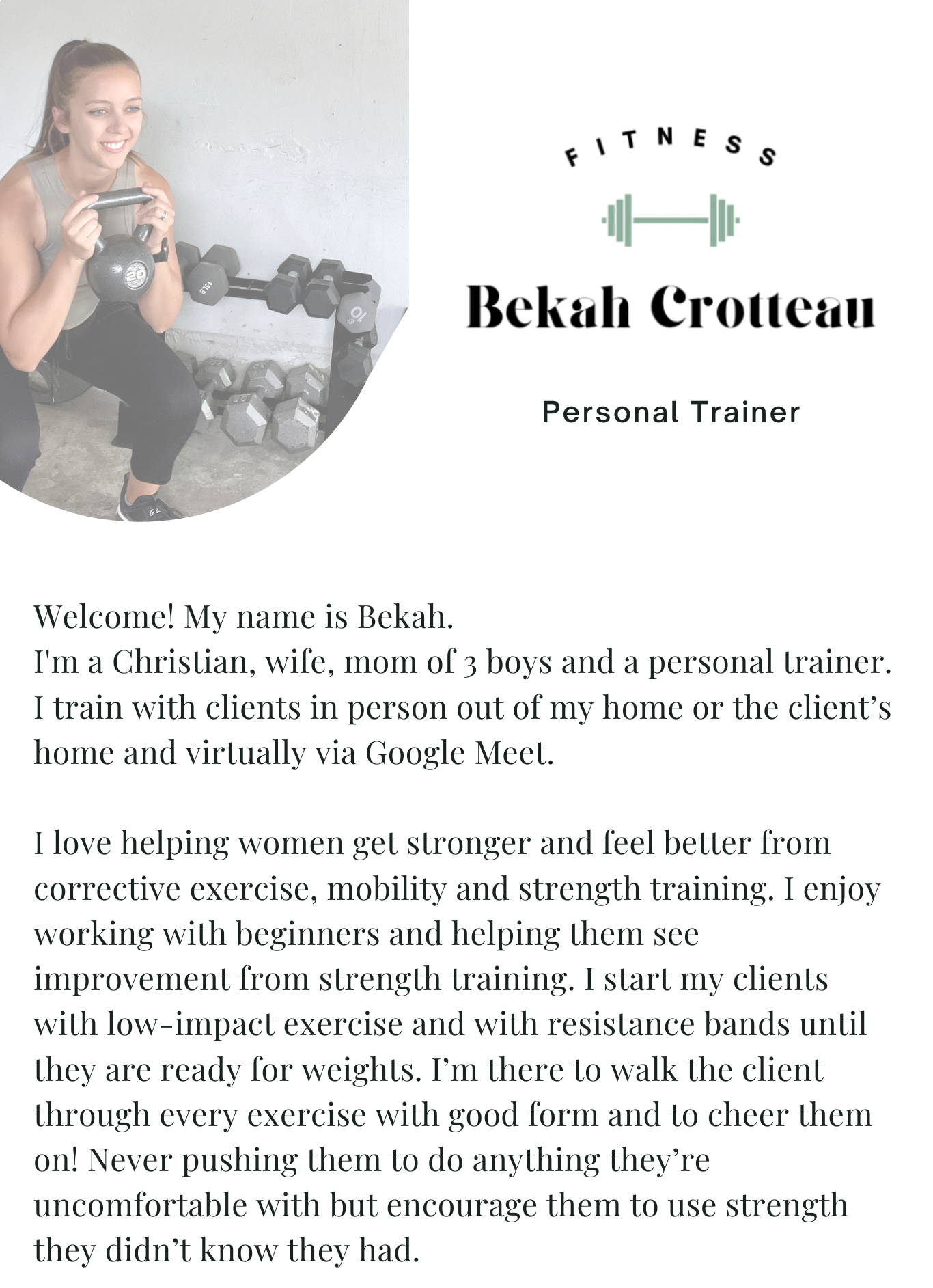 "Bekah is an amazing trainer! She absolutely is invested and genuinely interested in your goals and results! It is not at all a one size fits all approach when working with Bekah. She listens, analyzes and caters the program for YOU. She has helped me with posture issues in my upper back and shoulders, as well as fixing my duck foot problem. The change I've been able to see in just 4 weeks is HUGE. She is a joy to work with and I would HIGHLY recommend."